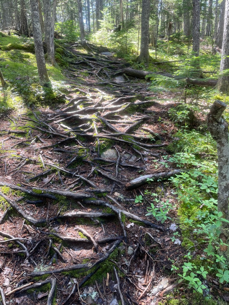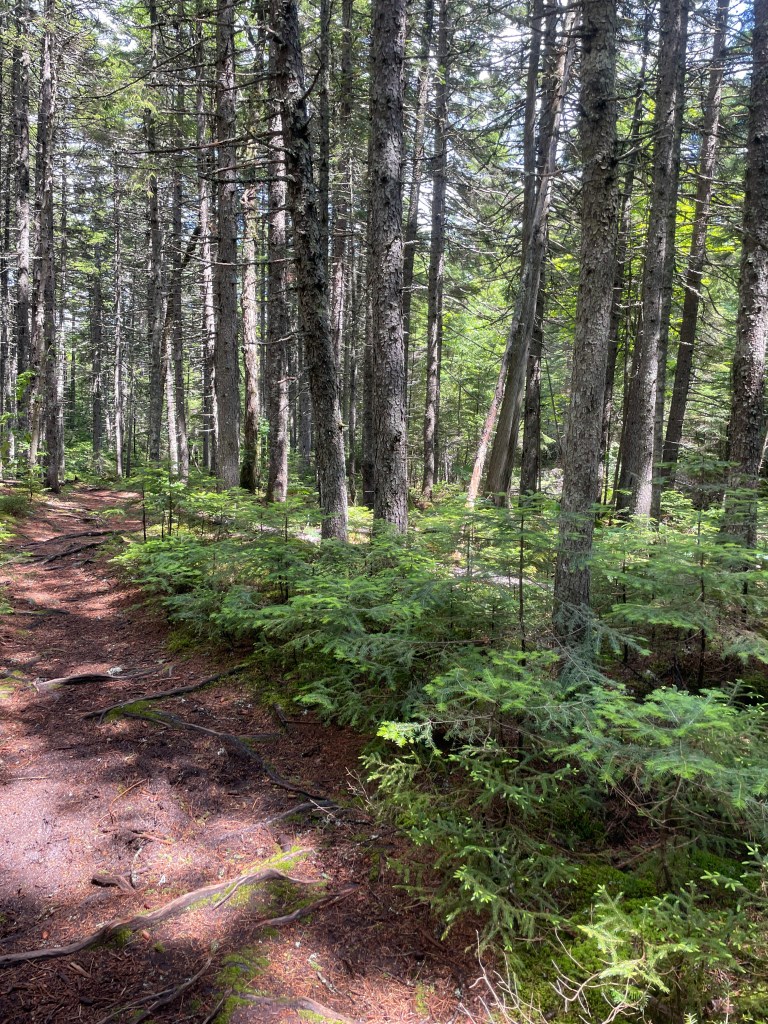 My initial impression of the 100 Mile Wilderness was one of awe. The forest was lush with ferns and tall trees. The dark brown forest floor contrasted against green plant life. Most noticeable was the quiet. No sound of man was present. No traffic nor construction was in the background. After growing accustomed to hearing distance, man-made noise while hiking in the mid Atlantic, I kept waiting for the Ewoks to appear as they did in one the the Star War Sequels. Absent was the simultaneous firing of fireworks and shotguns like I heard outside of Palmerton, PA last year at sunset. I’ll take a possible Ewok surprise over the Pennsylvania hootenanny any day!