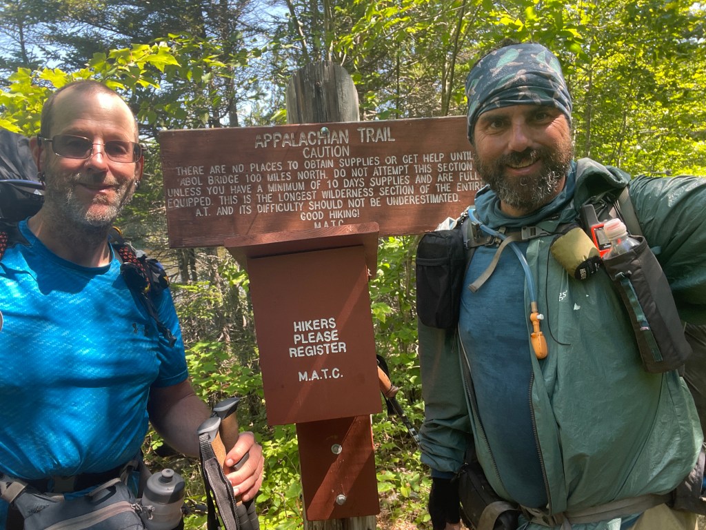 After having a subpar breakfast at the Abol Bridge Campground Restaurant, Squarepeg and I entered the Hundred Mile Wilderness. The warning sign from the Maine Appalachian Trail Club reminded us that no opportunity existed for resupply for the next hundred miles and to carry 10 days worth of food.